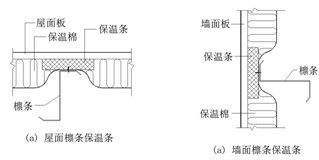 為解決由于保溫棉被壓縮而造成熱損失的現(xiàn)象,可以在屋面板墻面板與檁條交接部位設(shè)置保溫條(如圖5)。