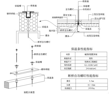 屋面檁條冷橋解決方案就是使用檁條保溫條和鋼結(jié)構(gòu)斷橋自攻螺釘。應(yīng)用方法就是在鋪設(shè)保溫棉之后,在固定自攻釘或安裝支架的部位,用斷橋自攻螺釘先行安裝防冷橋保溫條和鍍鋅鋼板(與檁條等厚度),將屋面板或支架固定在鍍鋅鋼板上。自攻釘或支架的間距就是平時(shí)固定屋面板或支架的間距,具體方法(見圖7)。