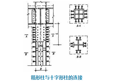 高層鋼結(jié)構(gòu)中的箱形柱與下部型鋼混凝土中的十字形柱相連時(shí),應(yīng)考慮截面形式變化處力的傳遞平順。箱形柱的一部分力應(yīng)通過(guò)栓釘傳遞給混凝土,另一部分力傳遞給下面的十字形柱,如下圖所示。兩種截面的連接處,十字形柱的腹板應(yīng)伸入箱形柱內(nèi),形成兩種截面的過(guò)渡段。伸入長(zhǎng)度應(yīng)不小于柱寬加200mm,即L≥B+200mm,過(guò)渡段截面呈田字形。過(guò)渡段在主梁下并靠緊主梁。