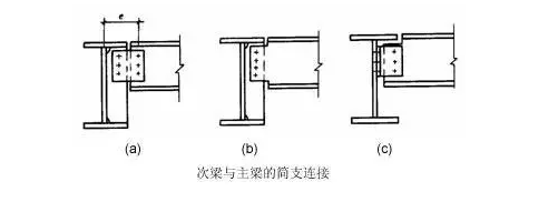 次梁與主梁的連接通常設(shè)計(jì)為鉸接,主梁作為次梁的支座,次梁可視作簡(jiǎn)支梁。其拼接形式如下圖所示,次梁腹板與主梁的豎向加勁板用高強(qiáng)度螺栓連接(圖a、b),當(dāng)次梁內(nèi)力和截面較小時(shí),也可直接與主梁腹板連接(圖c)。