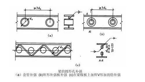 當(dāng)因開孔需要補(bǔ)強(qiáng)時(shí),彎矩由梁翼緣承擔(dān),剪力由孔口截面的腹板和孔洞周圍的補(bǔ)強(qiáng)板共同承擔(dān)。圓形孔的補(bǔ)強(qiáng)可采用套管、環(huán)形補(bǔ)強(qiáng)板或在梁腹板上加焊V形加勁肋等措施予以補(bǔ)強(qiáng),如圖下所示。