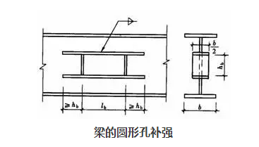 當(dāng)因管道穿過(guò)需要在梁腹板上開孔時(shí),應(yīng)根據(jù)孔的位置和大小確定是否對(duì)梁進(jìn)行補(bǔ)強(qiáng)。當(dāng)圓孔直徑小于或等于1/3梁高,且孔洞間距大于3倍孔徑,并避免在梁端1/8跨度范圍內(nèi)開孔時(shí),可不予補(bǔ)強(qiáng)。