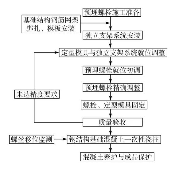 鋼結(jié)構(gòu)預(yù)埋螺栓的工藝流程圖如圖 1 所示 。