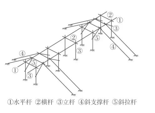 ( 4 )在斜拉桿與水平桿節(jié)點(diǎn)處向兩側(cè)架設(shè)斜支 撐 (支撐打入地基土深度約 30 cm ) ,然后在支撐附 近安裝橫向拉桿 ,并在基礎(chǔ)上部由水平桿和橫向拉 桿組成井字架 ,形成一空間幾何不變體 ,確保架體的 剛度和穩(wěn)定(見圖 2 ) 。