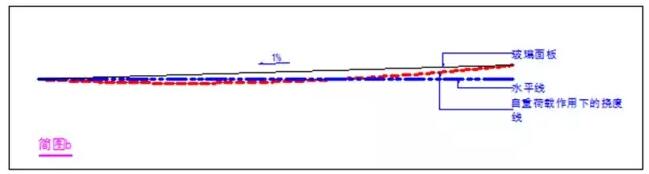 大家可以想到,風荷載屬于可變荷載,在風壓消失的時候,它對玻璃的荷載消失,所產(chǎn)生的變形相應消失,而玻璃的自重屬于永久荷載,它對玻璃產(chǎn)生的變形卻不會消失,那么它的變形就會如圖所示的那樣,在玻璃中部會有凹陷,形成一個天然的水坑或者說是垃圾坑,那么造成積水積灰就成必然了。