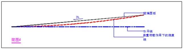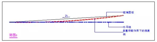 那么我們把坡度調(diào)整為2%呢,請大家看“簡圖c”,此時,水坑的底部基本與水平線相切,相對于水平面的凹陷現(xiàn)象基本消失,但是筆者卻也同時發(fā)現(xiàn),在實際中,按此方法設計的雨棚,還是會有少量的積水積灰現(xiàn)象的發(fā)生,這種現(xiàn)象筆者初步分析為施工上的少許誤差或支撐桿件所受永久荷載的變形所造成,那么我們就還有必要通過技術手段來解決此問題。