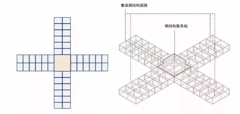 內(nèi)部為鋼結(jié)構(gòu)服務(wù)核,四周為箱式模塊結(jié)構(gòu)功能體