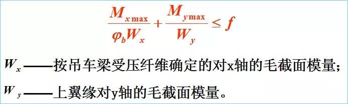 連有制動結(jié)構(gòu)的吊車梁,側(cè)向彎曲剛度很大,整體穩(wěn)定得到保證,不需驗算。加強上翼緣的吊車梁,整體穩(wěn)定公式: