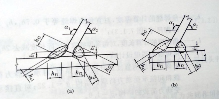 四、兩焊腳邊夾角α為60°≤α≤135°的T形接頭,其斜角角焊縫(圖2)的強(qiáng)度應(yīng)按公式3至公式5計(jì)算,但取βf=1.0,其計(jì)算厚度為:he=hfcosα/2(根部間隙b、b1或b2≤1.5mm)或he=[hf-b(或b1、b2)/sinα]cosα/2(b、b1或b2>1.5mm但≤5mm)。