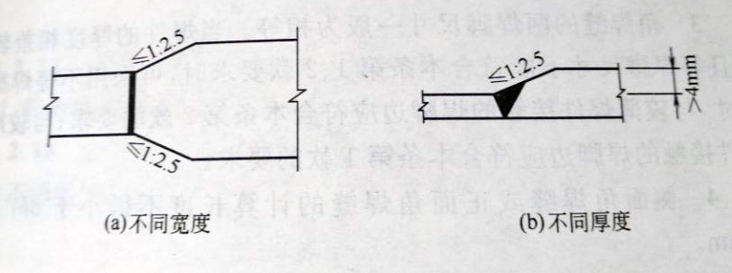 4、在對接焊縫的拼接處:當焊件的寬度不同或厚度在一側(cè)相差4mm以上時,應(yīng)分別在寬度方向或厚度方向從一側(cè)或兩側(cè)做成坡度不大于1:2.5的斜角(圖1);當厚度不同時,焊縫坡口形式應(yīng)根據(jù)較薄焊件厚度按第3條的要求取用。