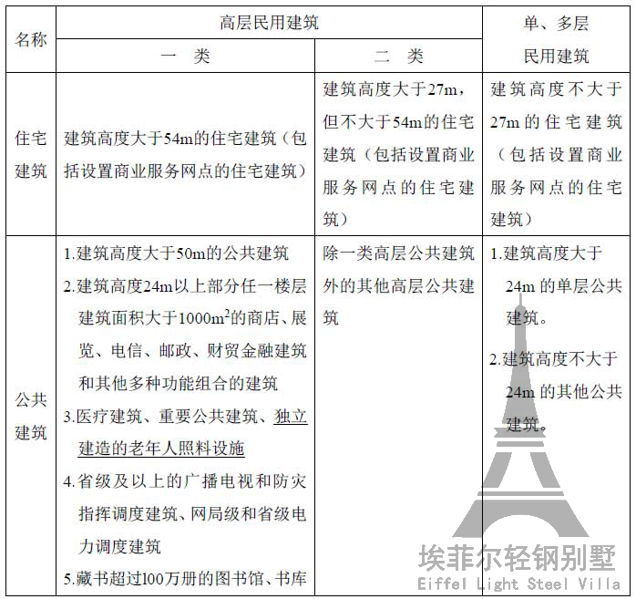 5.1.1 民用建筑根據(jù)其建筑高度和層數(shù)可分為單、多層民用建筑和高層民用建筑。高層民用建筑根據(jù)其建筑高度、使用功能和樓層的建筑面積可分為一類和二類。民用建筑的分類應符合表5.1.1的規(guī)定。