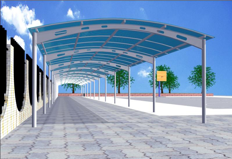 鋼結構雨棚 類型按與主體的連接方式分為鋼結構純懸挑式雨棚,鋼結構上拉壓桿式雨棚和鋼結構上下拉桿式雨棚三種類型,每種類型分別有不同形式。 鋼結構雨棚平面形式有矩形雨棚